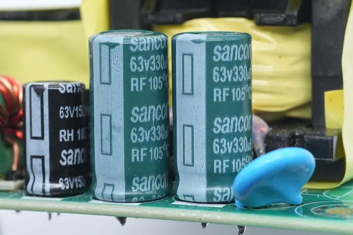 Kapasitor filter keluaran berasal dari Sancon (Nantong Sanxin), kapasitor umur panjang seri RF, dengan spesifikasi 63V 330μF, dua secara paralel.