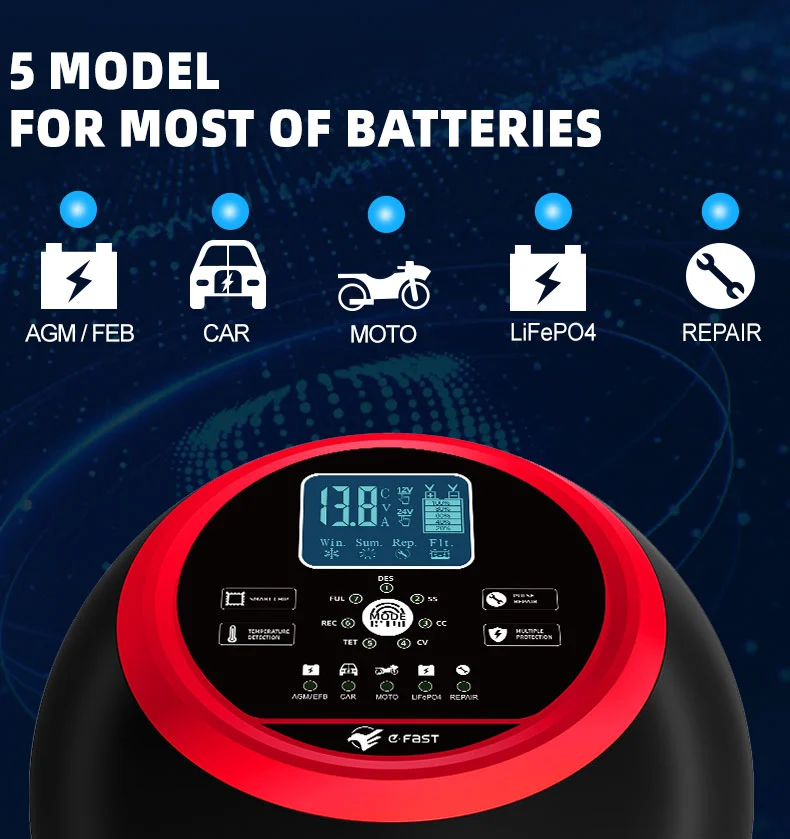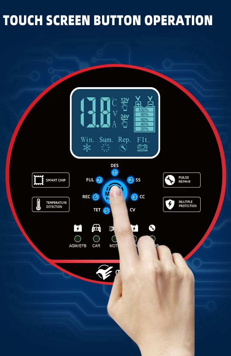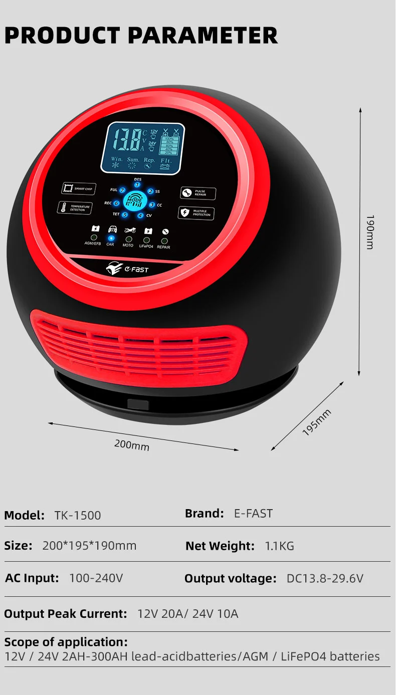 Pengisi daya ini memiliki desain ringkas yang inovatif dan dilengkapi dengan layar LCD definisi tinggi yang menunjukkan voltase, arus, suhu, kemajuan pengisian daya, dan status baterai secara real-time, membuat pengoperasian menjadi jelas dalam sekejap. Ia memiliki fungsi perbaikan pulsa bawaan yang dapat mengaktifkan dan memperbaiki baterai yang sudah tua, sehingga memperpanjang masa pakainya. Sebagai pengisi daya cerdas yang sepenuhnya otomatis, TK-1500 mendukung pengoperasian "pasang dan lupakan": secara otomatis mendeteksi tegangan baterai, memilih mode pengisian daya, dan beralih ke mode pemeliharaan pengisian daya mengambang setelah pengisian daya penuh untuk mencegah pengisian daya yang berlebihan. Ini sangat ideal untuk perawatan baterai kendaraan yang diparkir dalam waktu lama atau peralatan musiman seperti mesin pemotong rumput dan perahu.