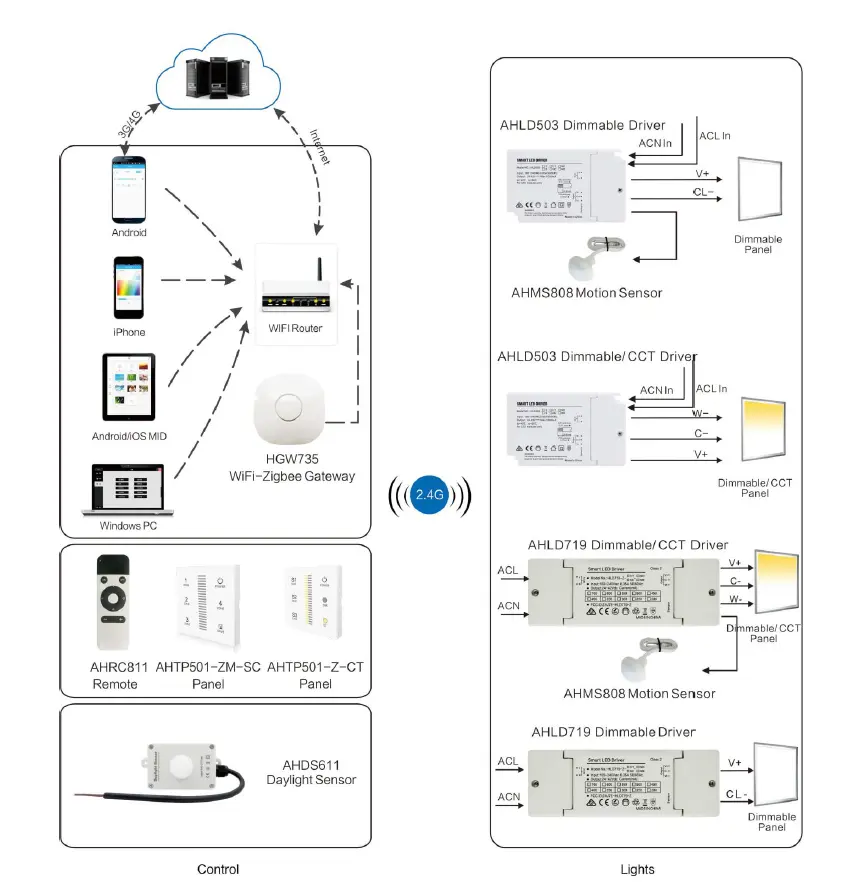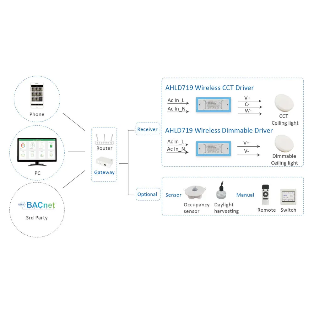 Pengemudi beroperasi dalam jaringan mesh Zigbee dan terhubung ke gateway Zigbee untuk mengaktifkan fungsi pencahayaan cerdas seperti penjadwalan, kontrol pemandangan, kontrol grup, dan otomatisasi. Jenis driver LED ini biasanya digunakan dalam sistem pencahayaan rumah pintar, instalasi pencahayaan komersial, dan lingkungan kontrol gedung yang cerdas.